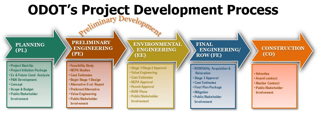 - ODOT Development Process. The project is finishing up the Environmental Engineering Phase and about to begin the Final Engineering/ROW Phase..